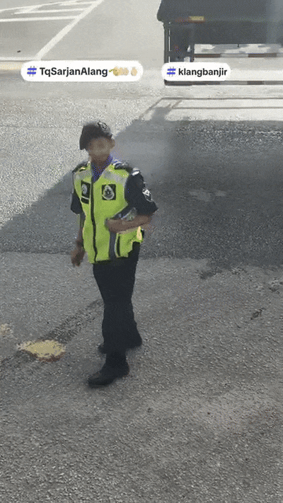 Towards the end of the clip, Sergeant Alang turns around, notices the person filming, and flashes a smile and a thumbs up before getting back to his ‘duties’.