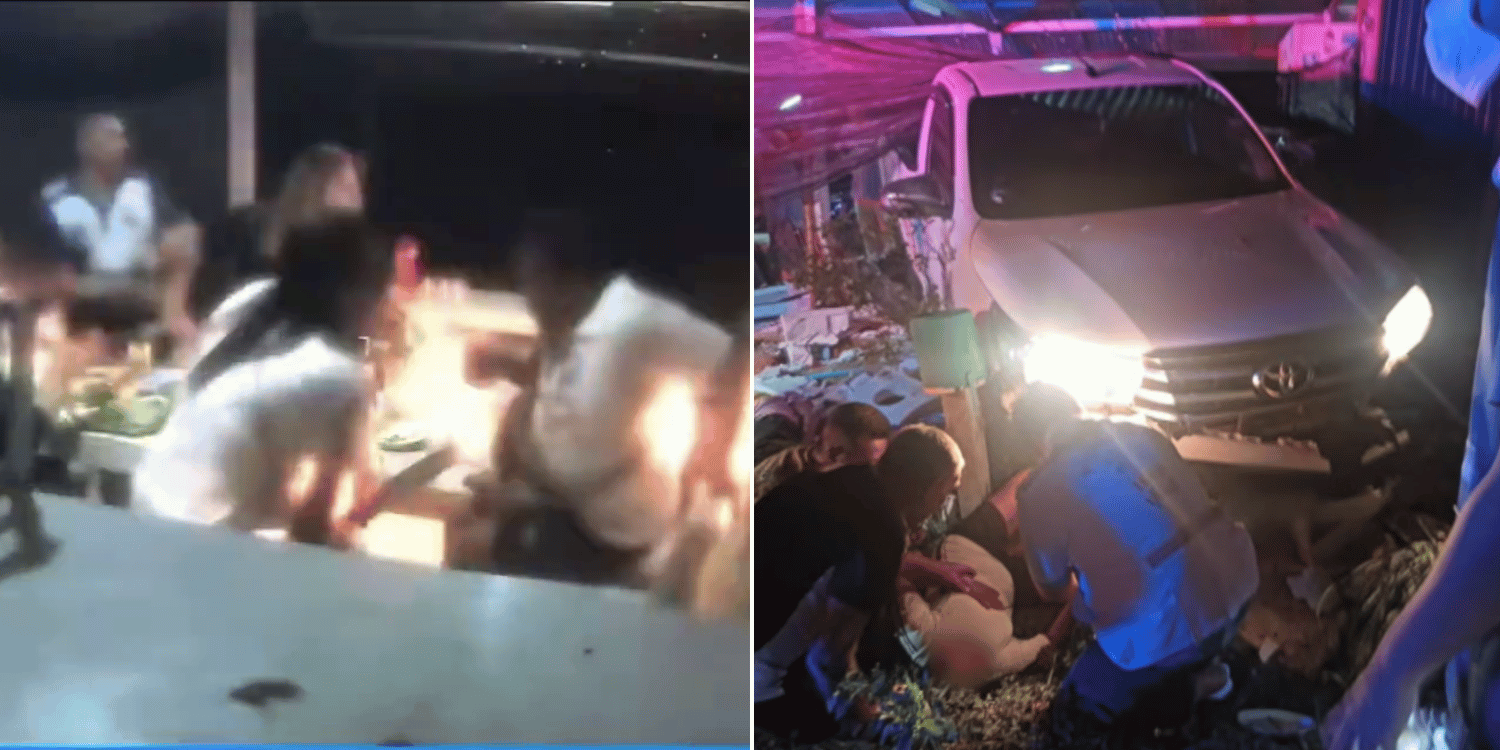 Footage circulating online shows a group of diners seated around a table with food and drinks when suddenly, the headlights of the truck can be seen approaching from off-screen.