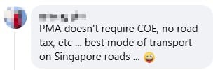 Several commenters also complained about what they perceived as the unfair advantages afforded to PMA riders, who use the road without paying any taxes or requiring a Certificate of Entitlement (COE).
