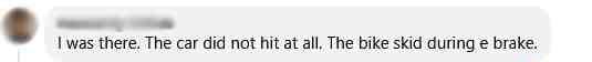 This Facebook user, who said they witnessed the incident, claimed that the motorcyclist had skidded and that the driver did not collide with them.