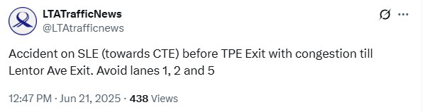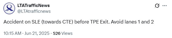 The Land Transport Authority’s (LTA’s) Traffic News account on X posted about the accident at 10.15am, saying that it had taken place in the direction of the Central Expressway (CTE), before the Tampines Expressway (TPE) exit.