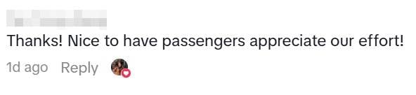 A private-hire driver also commented to thank her for appreciating drivers’ efforts, saying such gestures mean a lot.