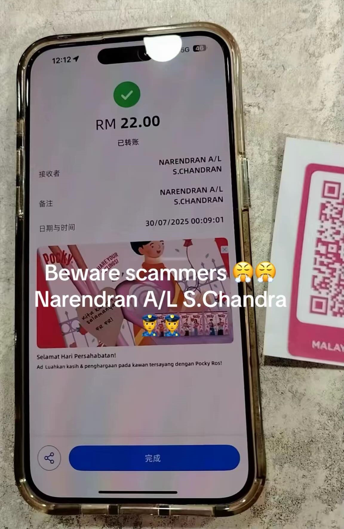 It shared a photo of a successful transfer of RM22 (S$6.63) made to an individual named “Narendran A/L S.Chandran”.