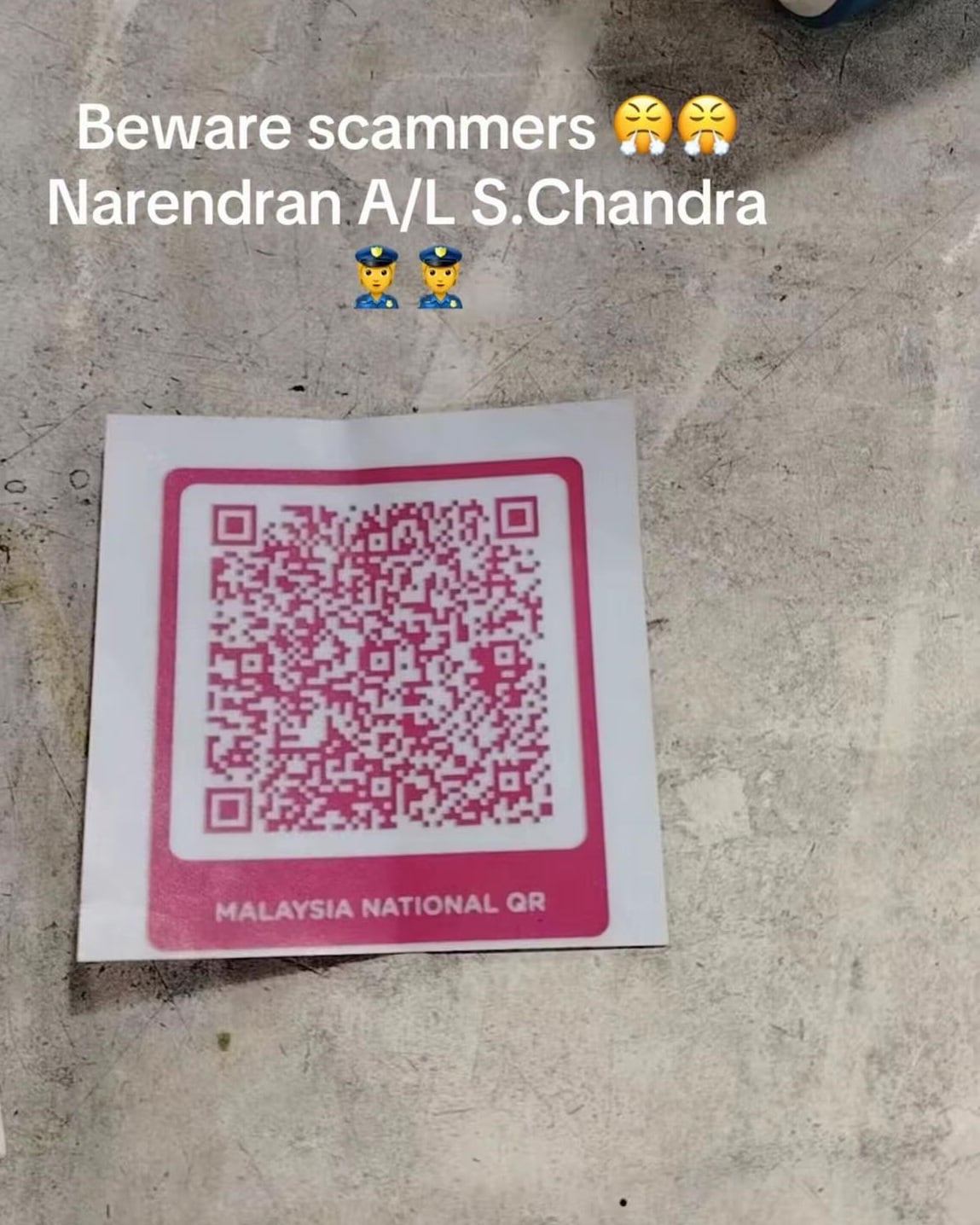 Later, they realised that someone had pasted their personal DuitNow QR code (similar to Singapore’s PayNow) on top of their payment code.