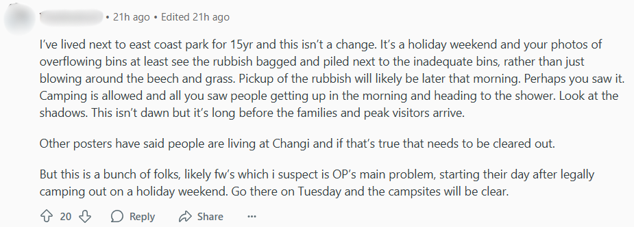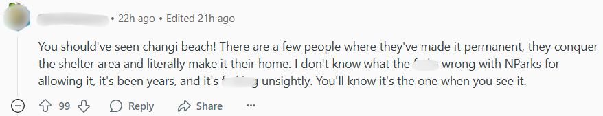 A few Redditors pointed out that similar conditions have been observed at other coastal areas like Changi Beach, with reports of tents becoming long-term fixtures.