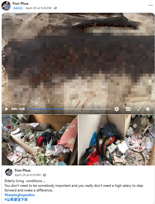 On 20 April, non-profit group Keeping Hope Alive visited Block 5 Banda Street and discovered the man’s one-room rental unit in appalling condition. The flat was overrun with clutter, cobwebs, rotting food and human waste.