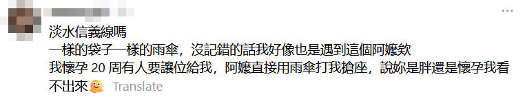 Translation: Was it on the Tamsui-Xinyi Line? Same bag, same umbrella… If I remember correctly, I think I encountered this grandma, too. I was 20 weeks pregnant, and someone offered me their seat, but the grandma hit me with her umbrella to take my seat, saying: “Are you fat or pregnant? I can’t tell”