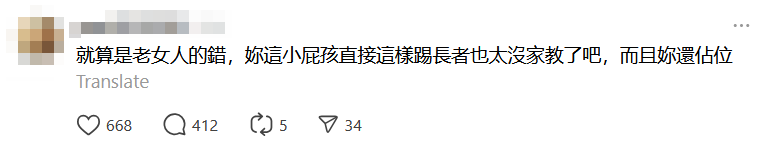 Translation: Even if it’s the elderly woman’s fault, a young person kicking an elder like that is really disrespectful. Plus, you’re the one taking the seat!