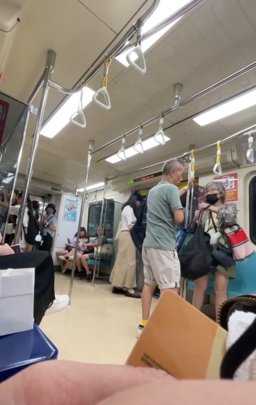 In the clip, the elderly woman, who was standing while carrying multiple bags and an umbrella, was seen deliberately hitting the seated passenger with one of her bags.