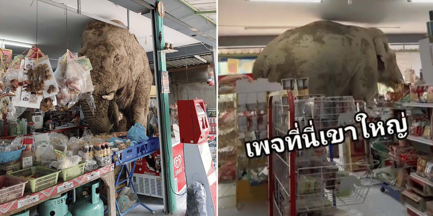 The elephant’s unexpected visit reportedly caused around 1,000 baht (S$40) in damage to shelving and goods as he searched for food.
