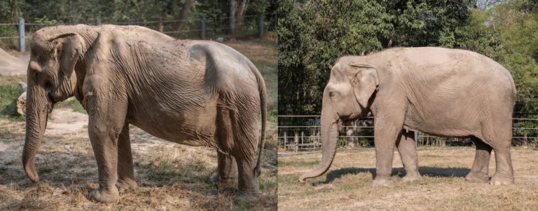 In photos depicting her profile, Pai Lin’s back slants downwards from her head, causing her hind legs to droop. Meanwhile, other elephants have a more prominent hump.
