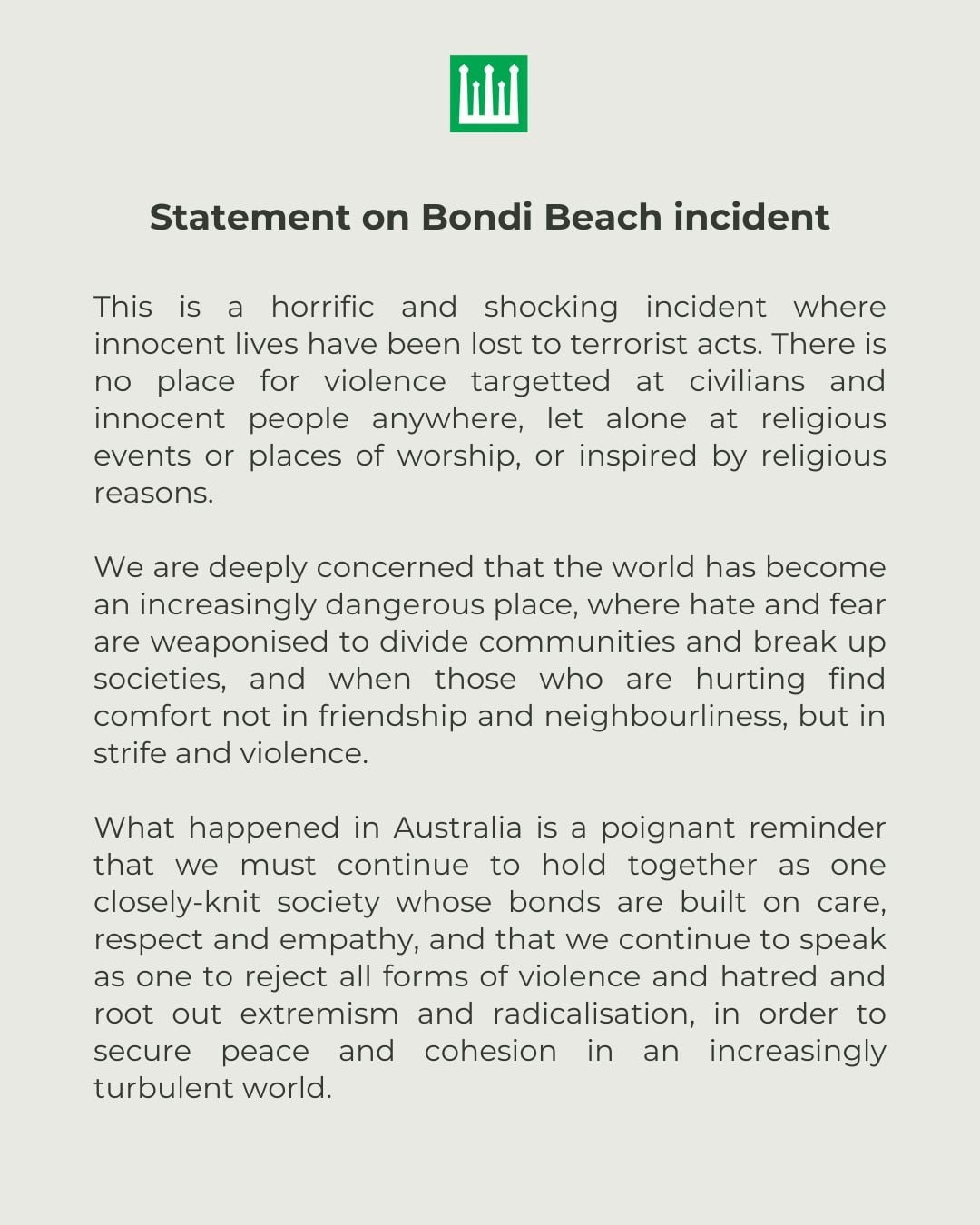In a statement issued on 15 Dec, the council condemned “all acts of anti-Semitism and any form of terrorism”, calling such violence a grave violation of the sanctity of human life.