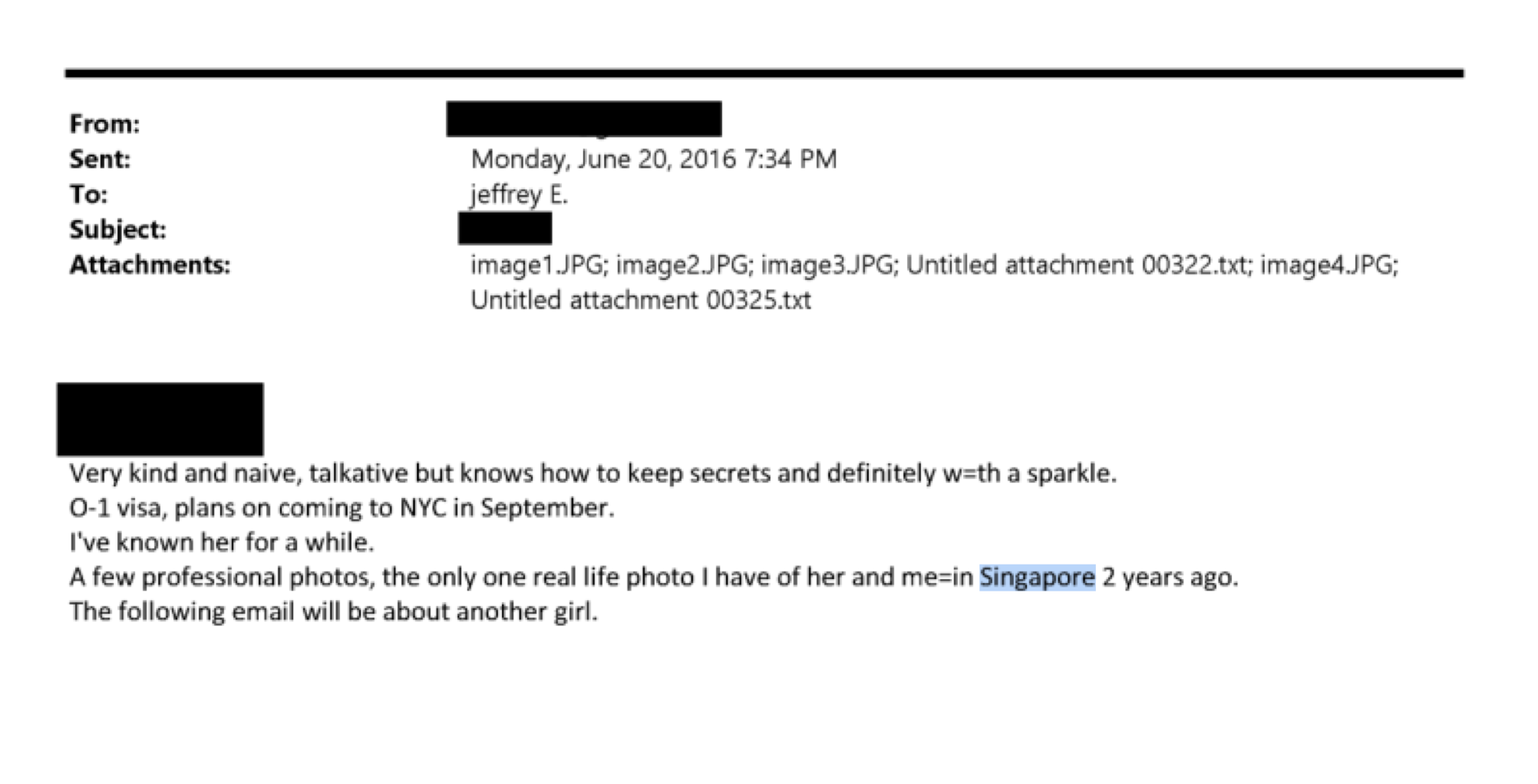 Girl & ‘very well trained’ service staff from S’pore mentioned in 2 separate emails addressed to Jeffrey Epstein