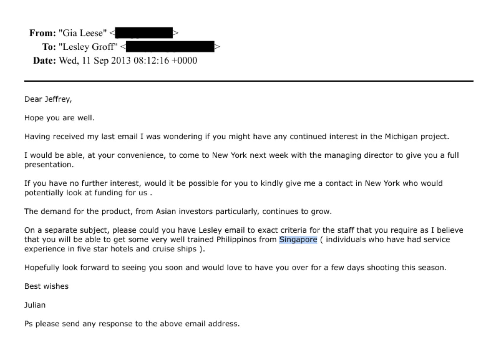 A separate 2013 email to Epstein from an individual named ‘Julian’ mentioned “very well trained” service staff from Singapore.