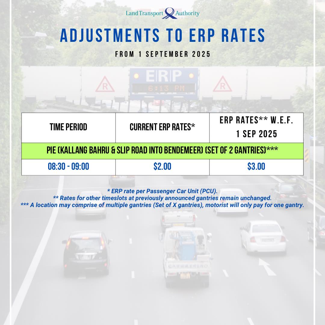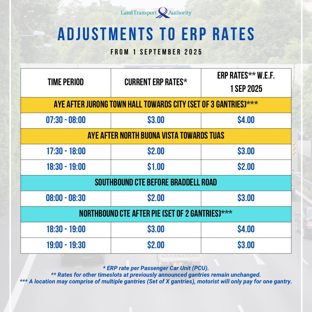 The last increase in ERP rates occurred in September 2024, when they rose by S$1 across three expressway locations.