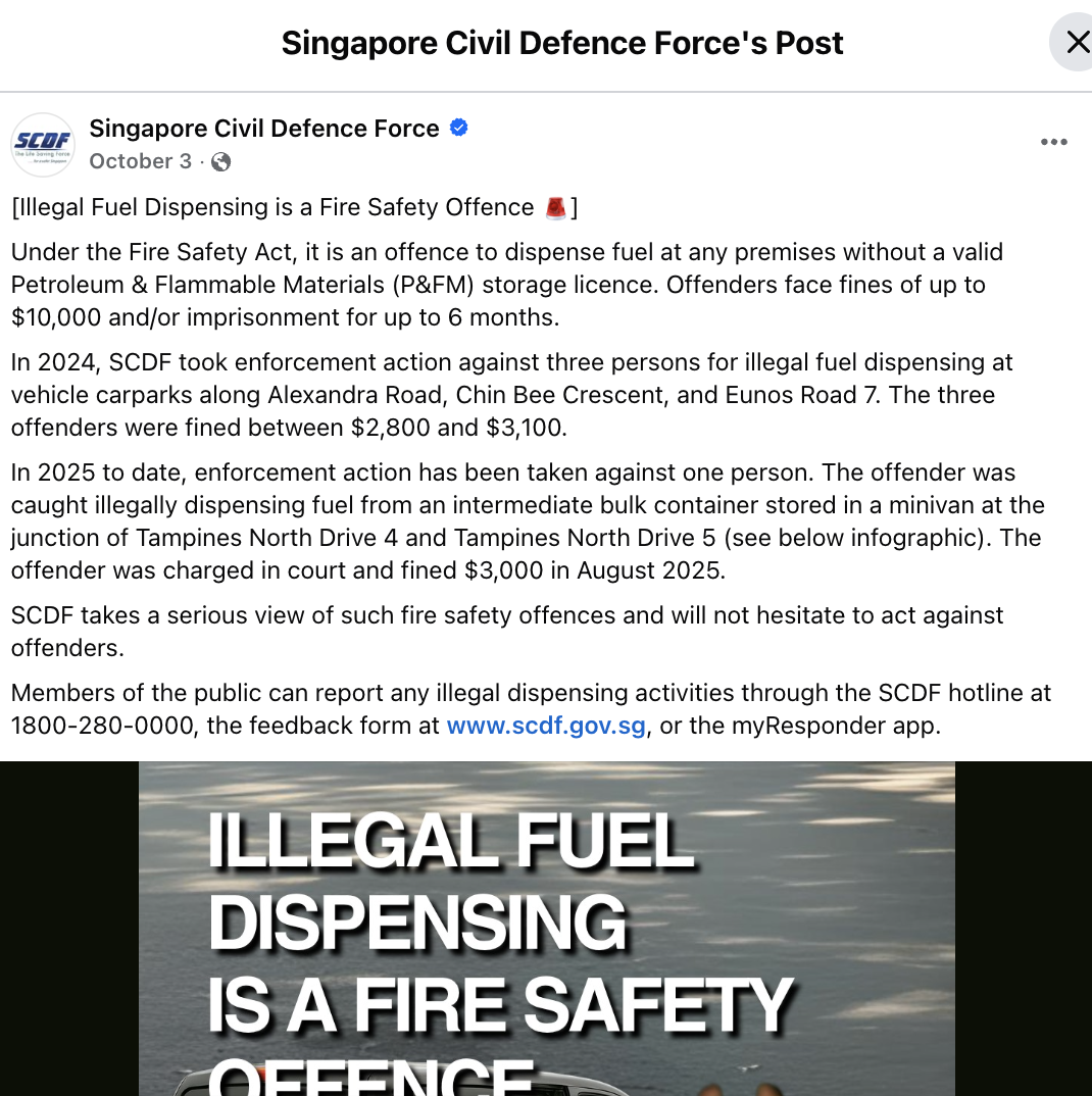 In 2024, the Singapore Civil Defence Force (SCDF) carried out enforcement action against individuals inolved in illegal fuel dispensing activities along the same road.
