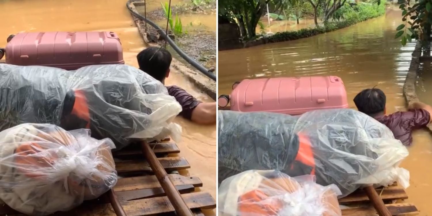 The viral TikTok video, shared by the daughter on 11 Oct, shows her father navigating through murky floodwaters and pulling a bamboo raft filled with her luggage.
