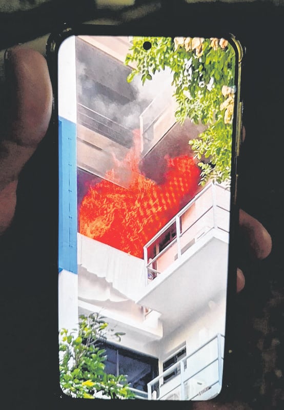 The resulting fire engulfed the flat’s kitchen, with flames leaping out of the window, according a photo she shared.
