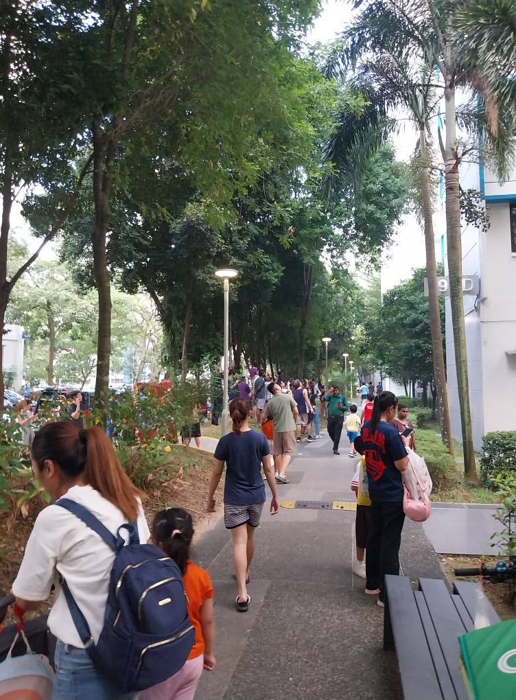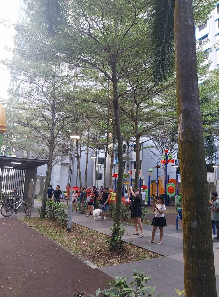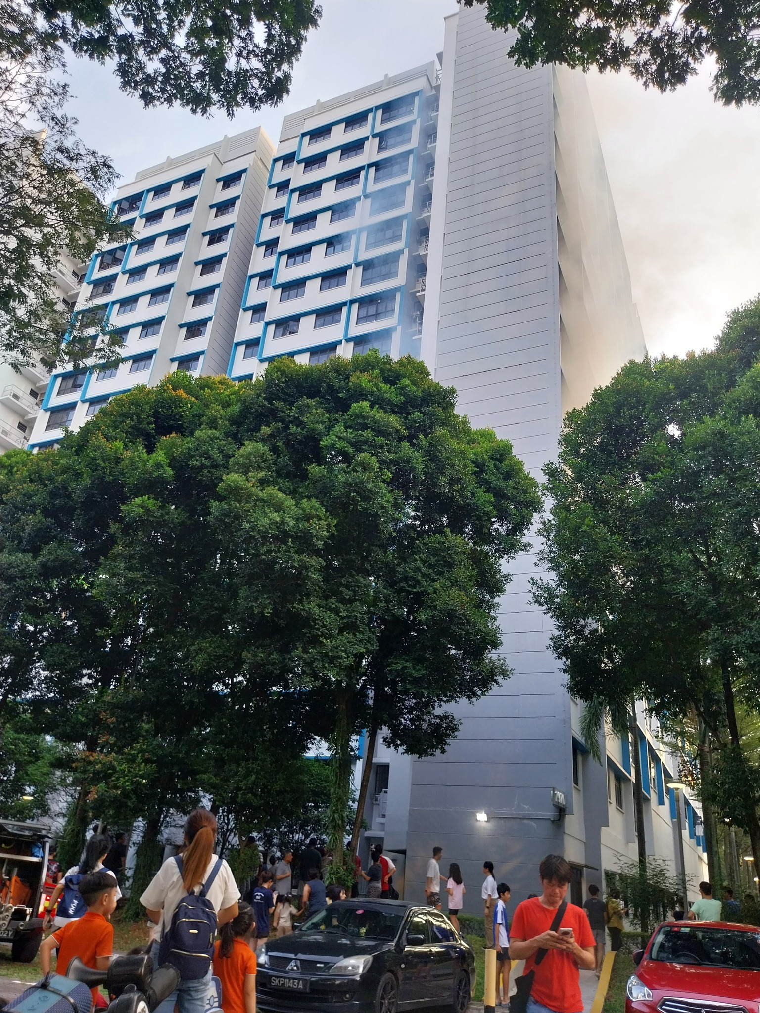 Crowd gathers below Boon Lay unit on fire