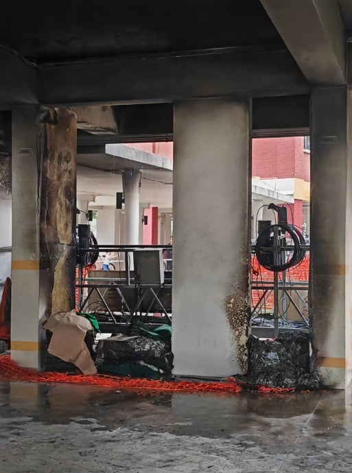 After the fire had been put out, the OP shared photos of the affected void deck, whose walls and pillars were blackened by the fire.