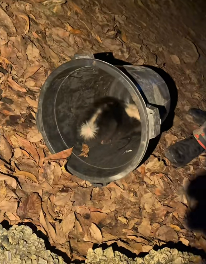 Just when they thought the fugitive was secured, the skunk made a break for it, prompting a brief chase before firefighters finally trapped it under the bin.