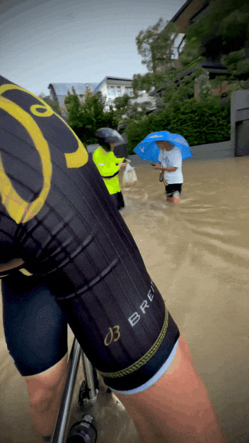 The scene was captured on video by cyclist Vincent and shared on Instagram, highlighting the rider’s determination despite the difficult conditions.