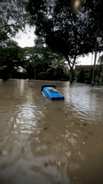 Floating residential recycling bins and rubbish were spotted in the water, underscoring the severity of the flood.