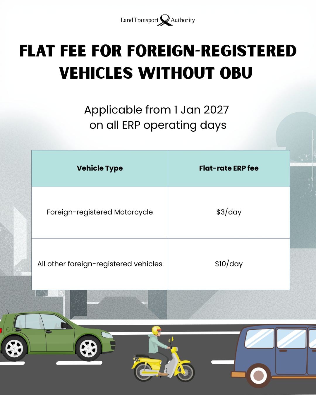 The changes include an increase to the Vehicle Entry Permit (VEP) and Goods Vehicle Permit (GVP) fees, as well as the introduction of flat-rate Electronic Road Pricing (ERP) charges for foreign vehicles without the new On-Board Unit (OBU).