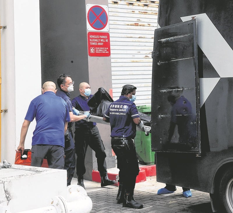Workers from Singapore Casket were later seen loading the body into a police hearse at about 11.55am.