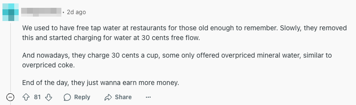 Many netizens chimed in with their support, with one netizen recalling how some restaurants used to offer it for free, before quietly introducing a charge of 30 cents for “free-flow water”.