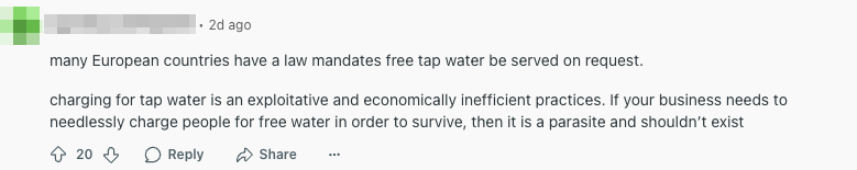 Another drew comparisons to many European countries, where they have a law that mandates free tap water be served on request.