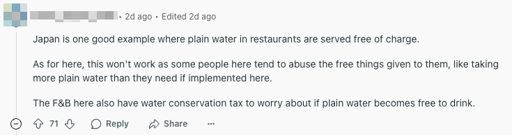 However, not all were on board. Some Redditors felt that giving out free tap water in Singapore would lead to abuse.