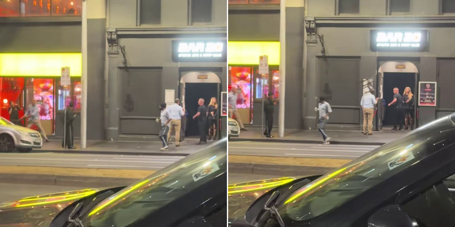 Footage shared by 7News shows one of the men being shoved to the ground outside the bar as bouncers repeatedly told them to leave.