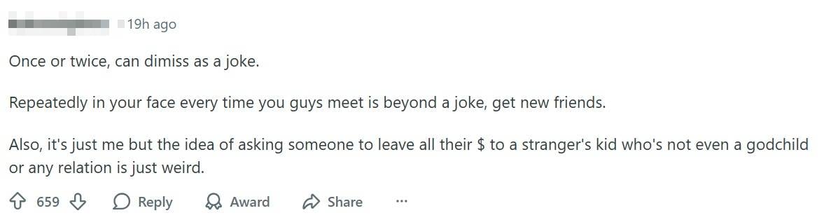 Friend keep "jokingly" ask me to leave my money to their kid.