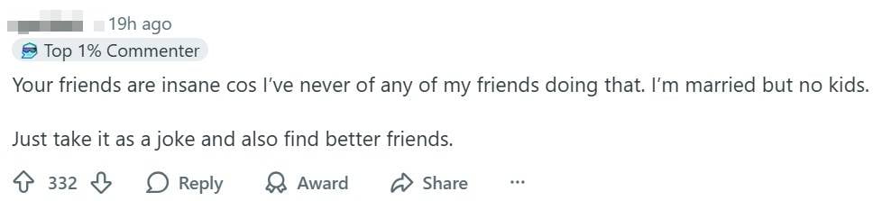 Another Redditor, who is married but has no children, labelled the friends as “insane” for even joking about such matters.