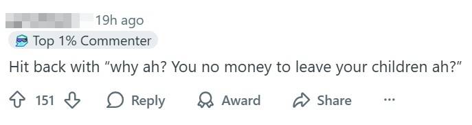 A third commender jokingly advised the OP to ask their friend back: “Why ah? You no money to leave your children ah?”
