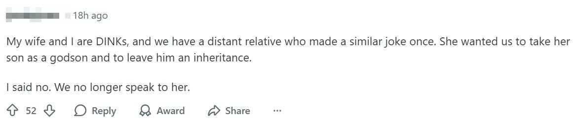 Meanwhile, one netizen shared how they rejected and stopped contacting a distant relative who had made a similar joke once.