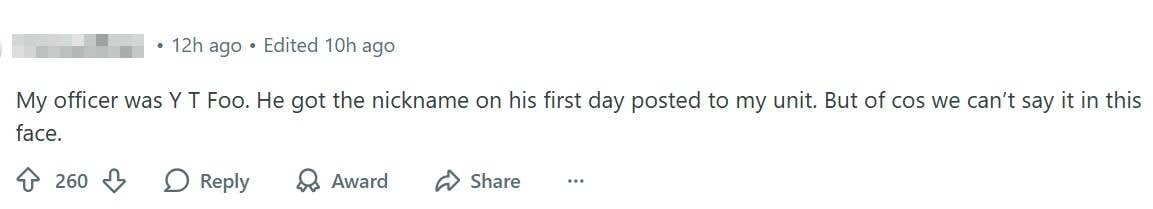 One netizen recalled an officer who actually had the initials “Y T Foo”, promptly earning him the nickname “yong tau foo”.