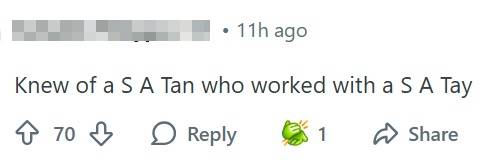 Others chimed in with equally amusing combinations, including an “S A Tan” who served alongside an “S A Tay” during their national service days.