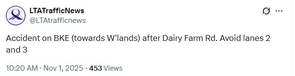 In a post on X, LTA said at 10.20am that the accident took place along the BKE in the direction of Woodlands, after Dairy Farm Road.