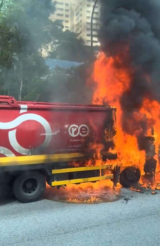 The truck’s logo indicated that it belonged to Re Sustainability Environmental Pte Ltd, a local waste management company.