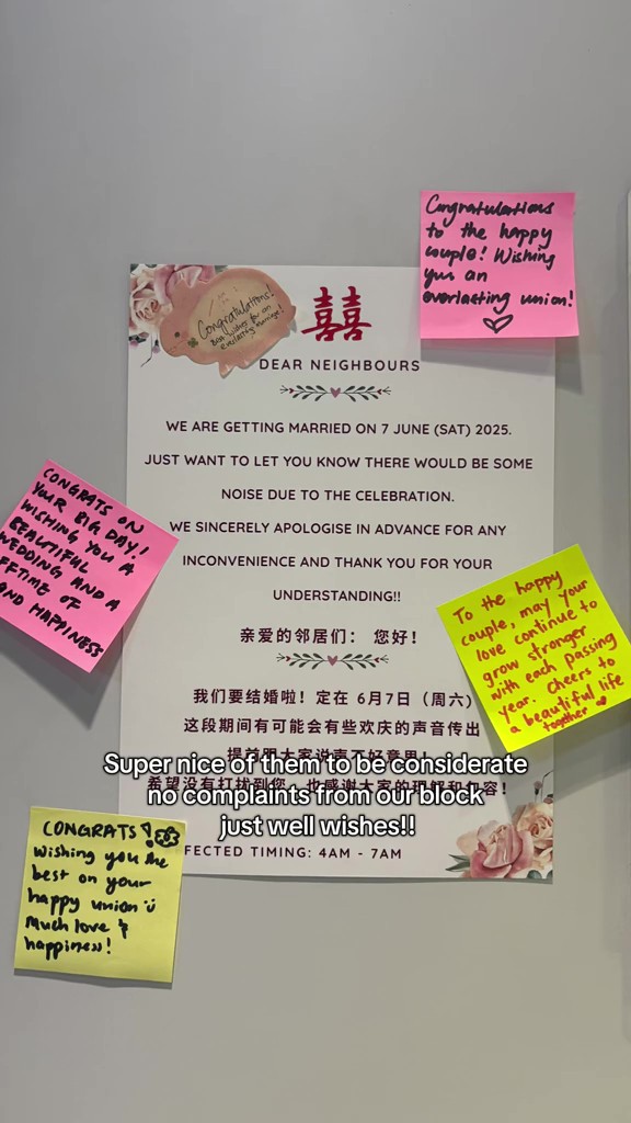“We are getting married,” the notice read. “There would be some noise due to the celebration…We sincerely apologise for any inconvenience.”