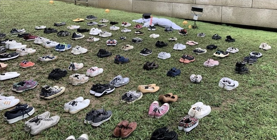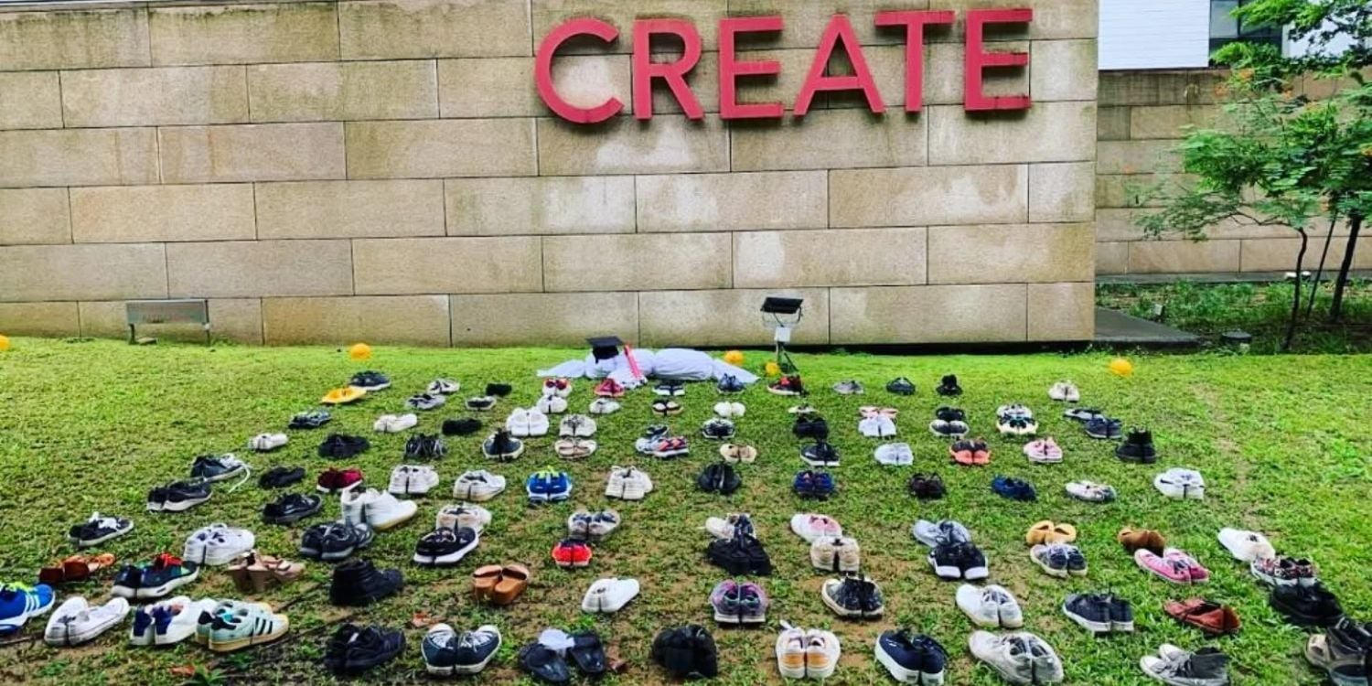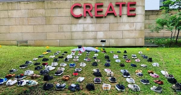 It featured 124 pairs of shoes and a white burial shroud placed in front of the CREATE research building on the NUS campus.