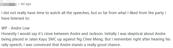 She noted that residents only learned Andre Low would be their candidate on Nomination Day, in contrast to Mr Ng.