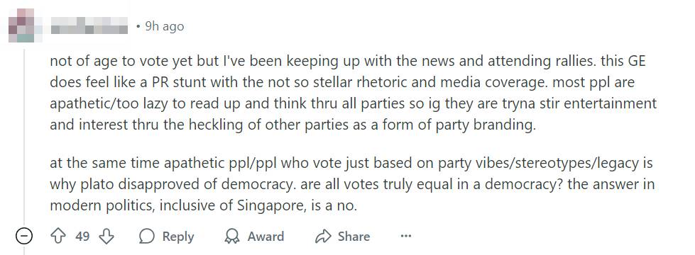 Meanwhile, a younger netizen — not yet eligible to vote — shared that while attending rallies and browsing campaign materials online, they noticed that most Singaporeans seemed “apathetic or too lazy” to dig into what each party actually stood for.