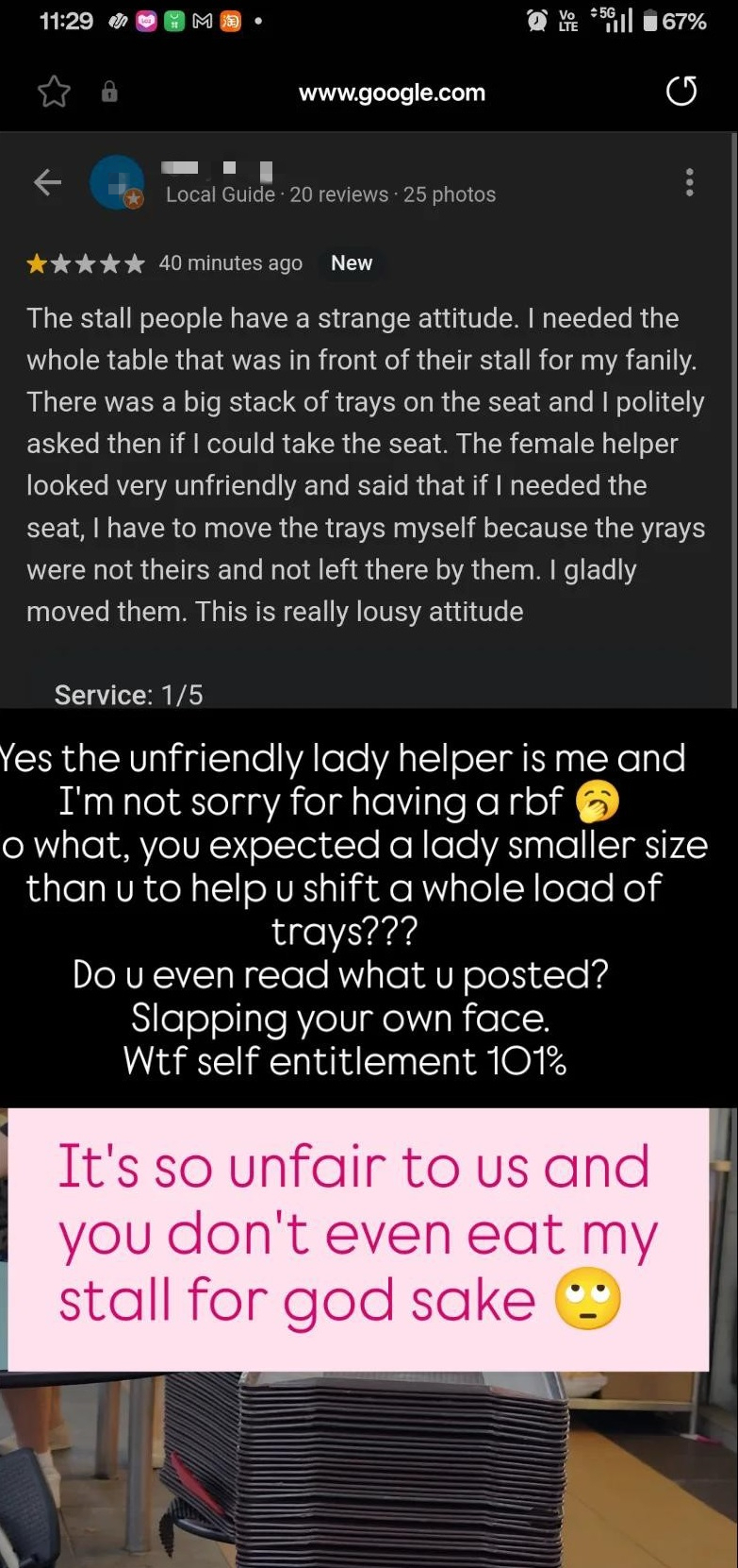 She reiterated that he did not even eat from her stall, and his review smacked of “self-entitlement”.