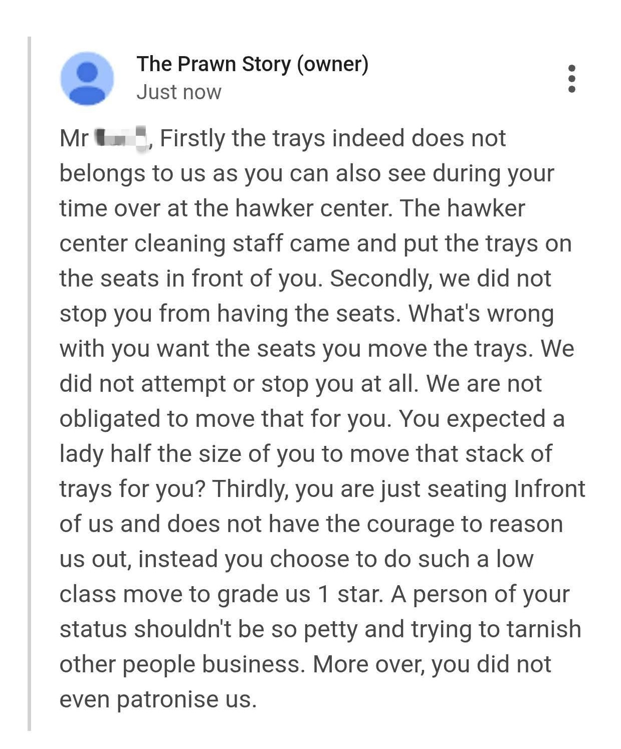 It also pointed out that the man did not say anything to the hawkers despite sitting right in front of the prawn noodle stall. The owner of The Prawn Story also described the man’s act of leaving a one-star review as “low-class” and “petty”.