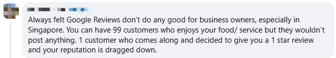 One said Google reviews “don’t do any good” for businesses, “especially in Singapore” as just one customer who gives a one-star review can drag the reputation down.