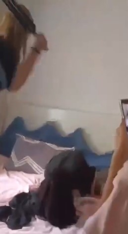 Worse still, one of the girls hits her hard with a metal object that appears to be a tripod.