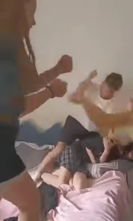 Two other girls laugh and pretend to box each other, while a third girl records the beating with her phone as the boy continues his incessant blows.
